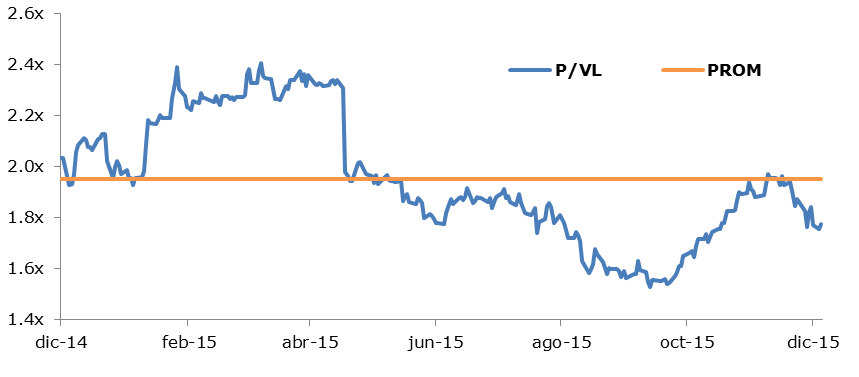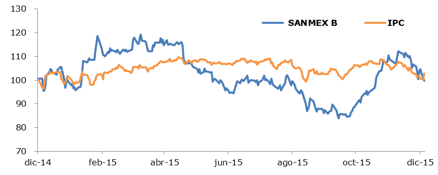 - Prevemos un crecimiento más conservador en cartera que el registrado históricamente donde consideramos que SANMEX pondrá énfasis en realizar mayores inversiones, sobretodo, en plataformas digitales, con lo que esperamos un mayor cobro de comisiones. Reiteramos nuestra valuación fundamental con un Valor Intrínseco 12 meses en 2016 en MXN 34, con una opinión de inversión en Compra.