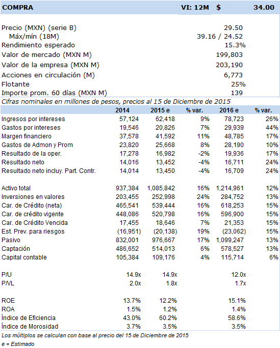 Por lo anterior, estamos estimando que los beneficios que se obtendrán de un fondeo basado en un mayor crecimiento de la captación de bajo costo, compensará el aumento en el 2016 de las comisiones derivadas por un mayor cobro de servicios de la banca electrónica y otros servicios, así como el aumento en los gastos de administración previstos por este tipo de inversiones en tecnología, por lo que estamos proyectando en 2016 una utilidad neta por MXN 16,709 millones, ubicando nuestra valuación fundamental con un Valor Intrínseco 12 meses en MXN 34, reiterando nuestra opinión de inversión en Compra.